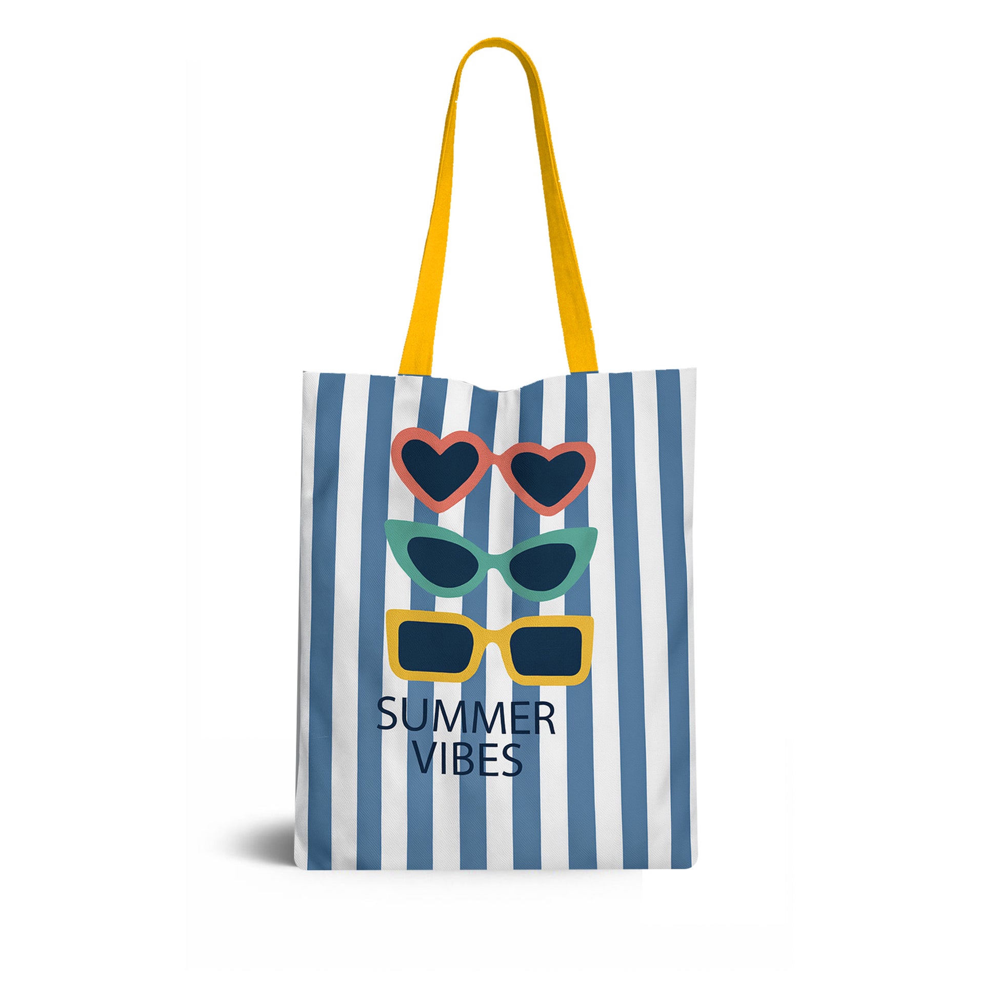 Bolsa ligera y resistente con estampado de rayas y gafas de colores, un diseño veraniego. Ideal para el día a día, playa o escapadas, cómoda de llevar al hombro. Hecha en poliéster reciclado.