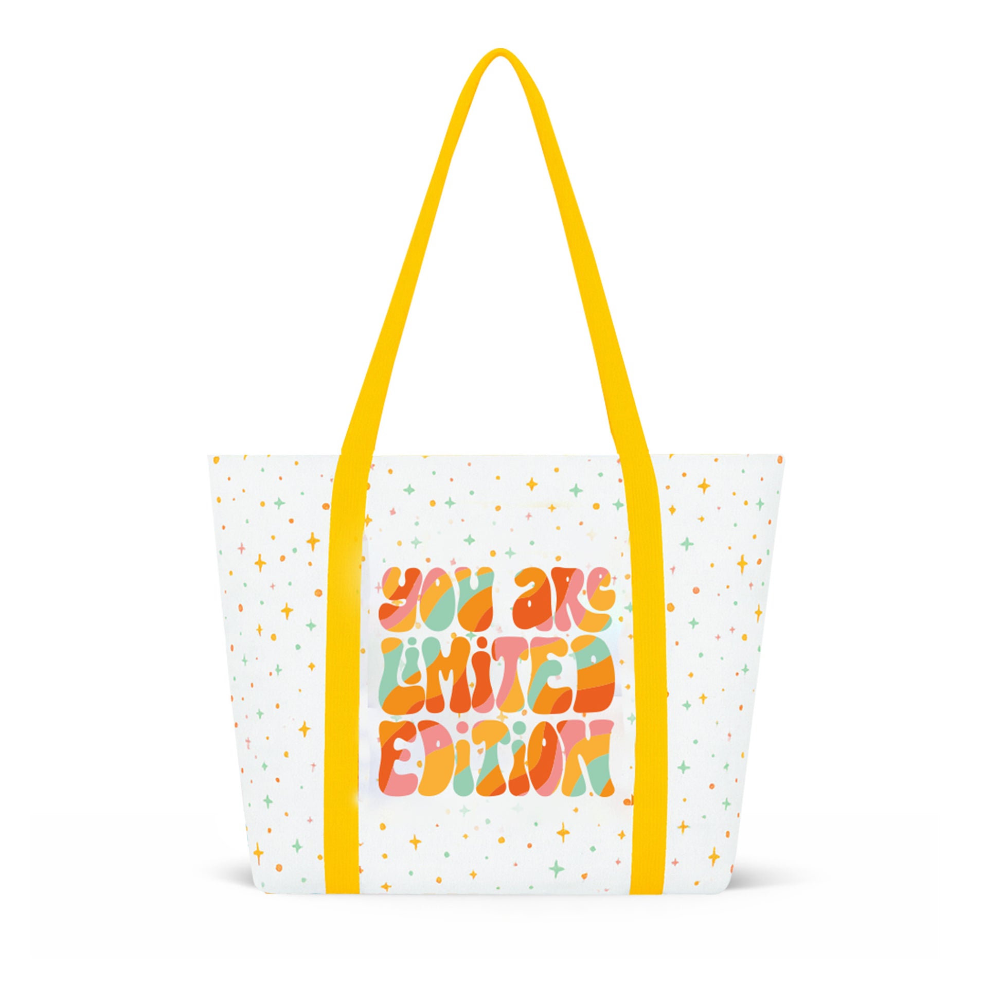 Bolsa amplia y resistente con estampado de tipografía y estrellas, un diseño veraniego. Cuenta con asas largas para llevar al hombro y un pequeño bolsillo interior para organizar lo esencial. Perfecta para playa, día a día o escapadas.
