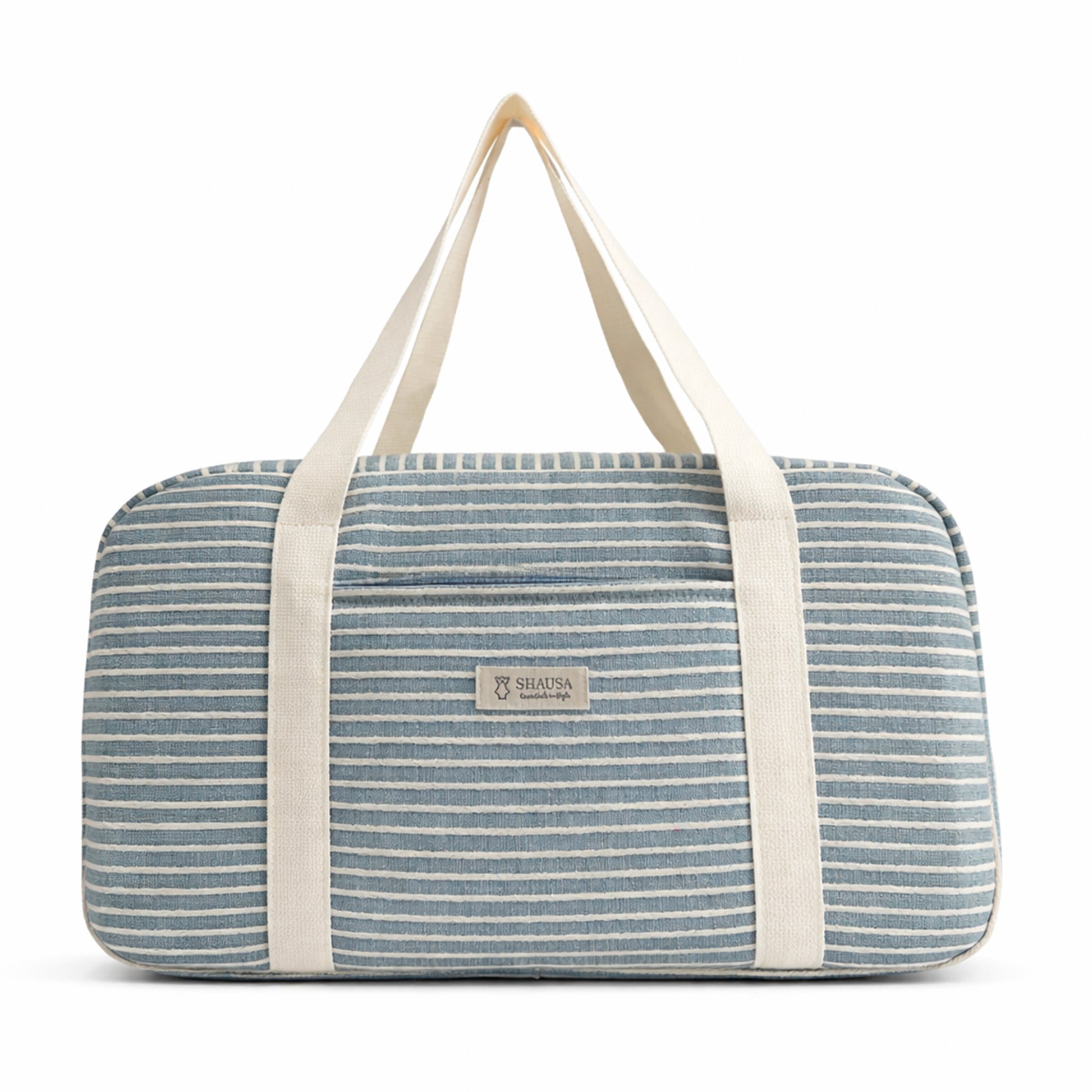 Este bolso de viaje fin de semana de rayas azul y blanco combina estilo marinero y funcionalidad en un formato amplio y cómodo. Confeccionado en poliéster resistente con detalle en relieve de cuerda de algodón, aporta textura y personalidad al diseño.