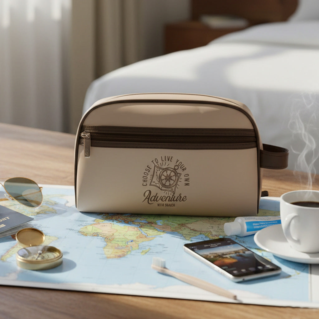 Neceser de estilo aventurero con diseño sobrio y elegante. Práctico y resistente, ideal para organizar artículos de aseo en viajes y escapadas, combinando funcionalidad y carácter atemporal.