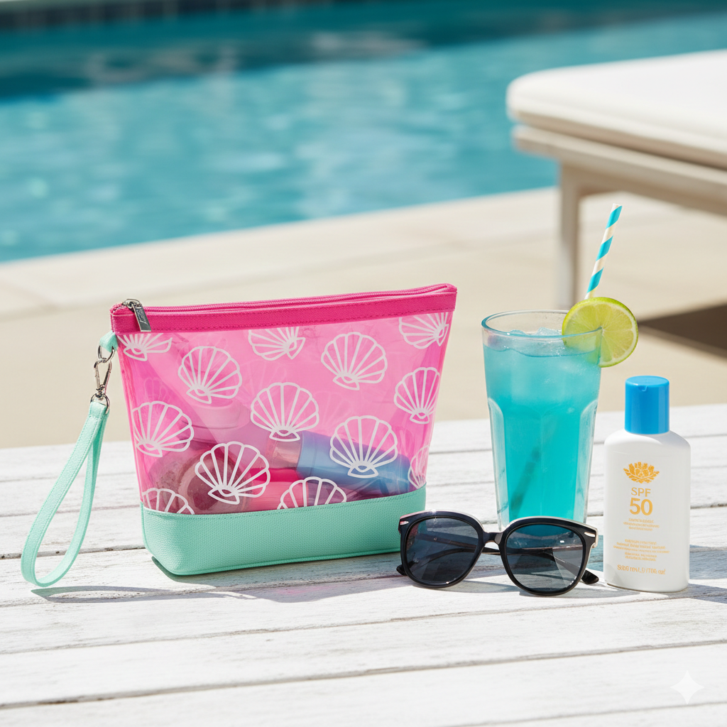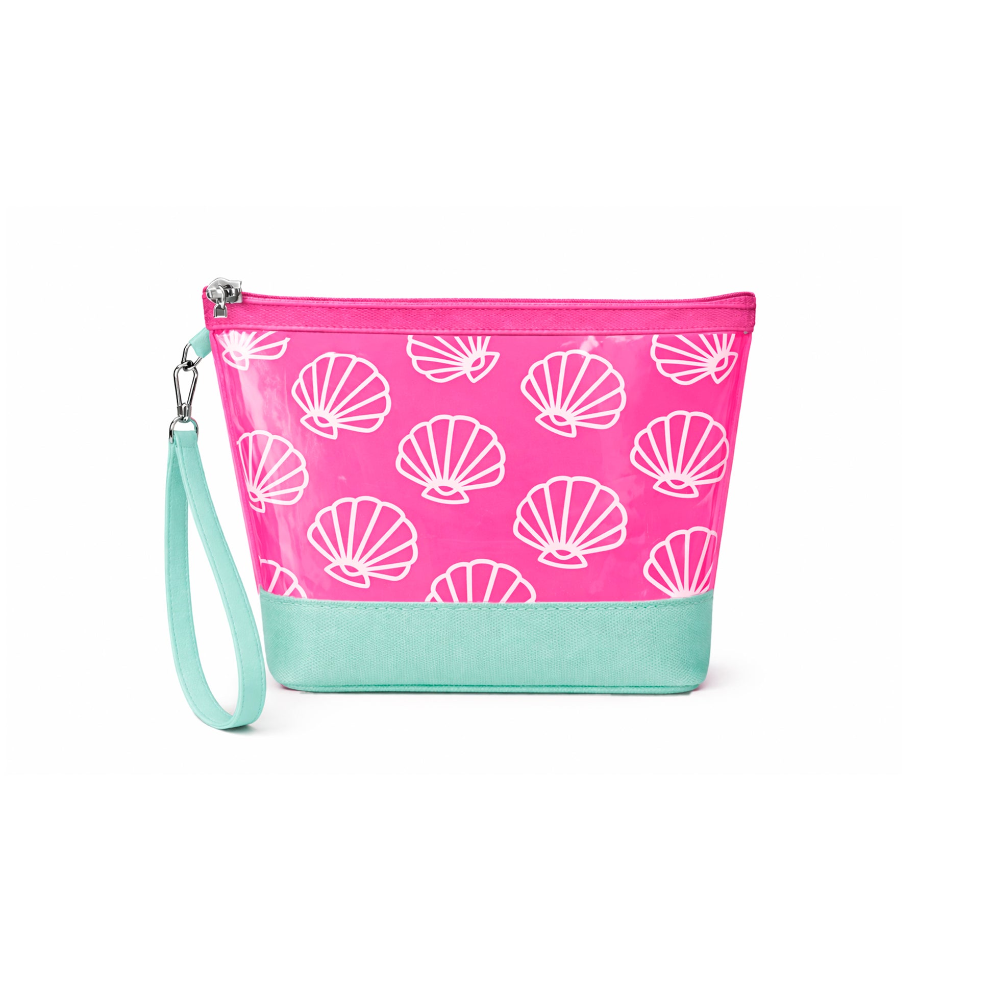 Neceser translúcido en color fucsia con estampado de conchas y base verde agua. Cuenta con cierre de cremallera y asa de mano para mayor comodidad. Ligero y práctico, ideal para playa, piscina o uso diario.