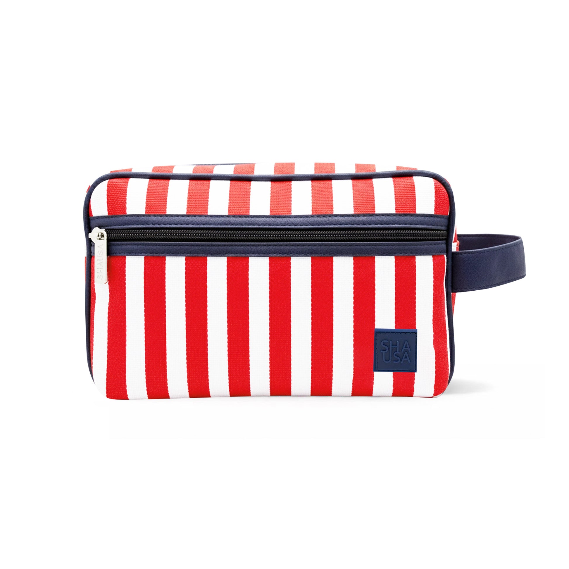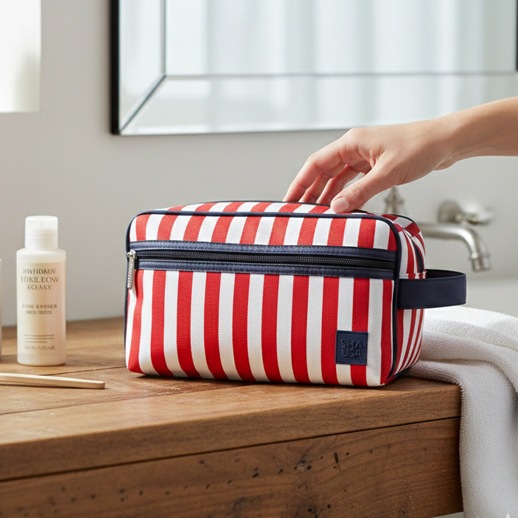 Neceser de hombre con diseño clásico de rayas, práctico y resistente. Ideal para organizar artículos de aseo y viaje, combina funcionalidad y estilo atemporal para el día a día o escapadas.