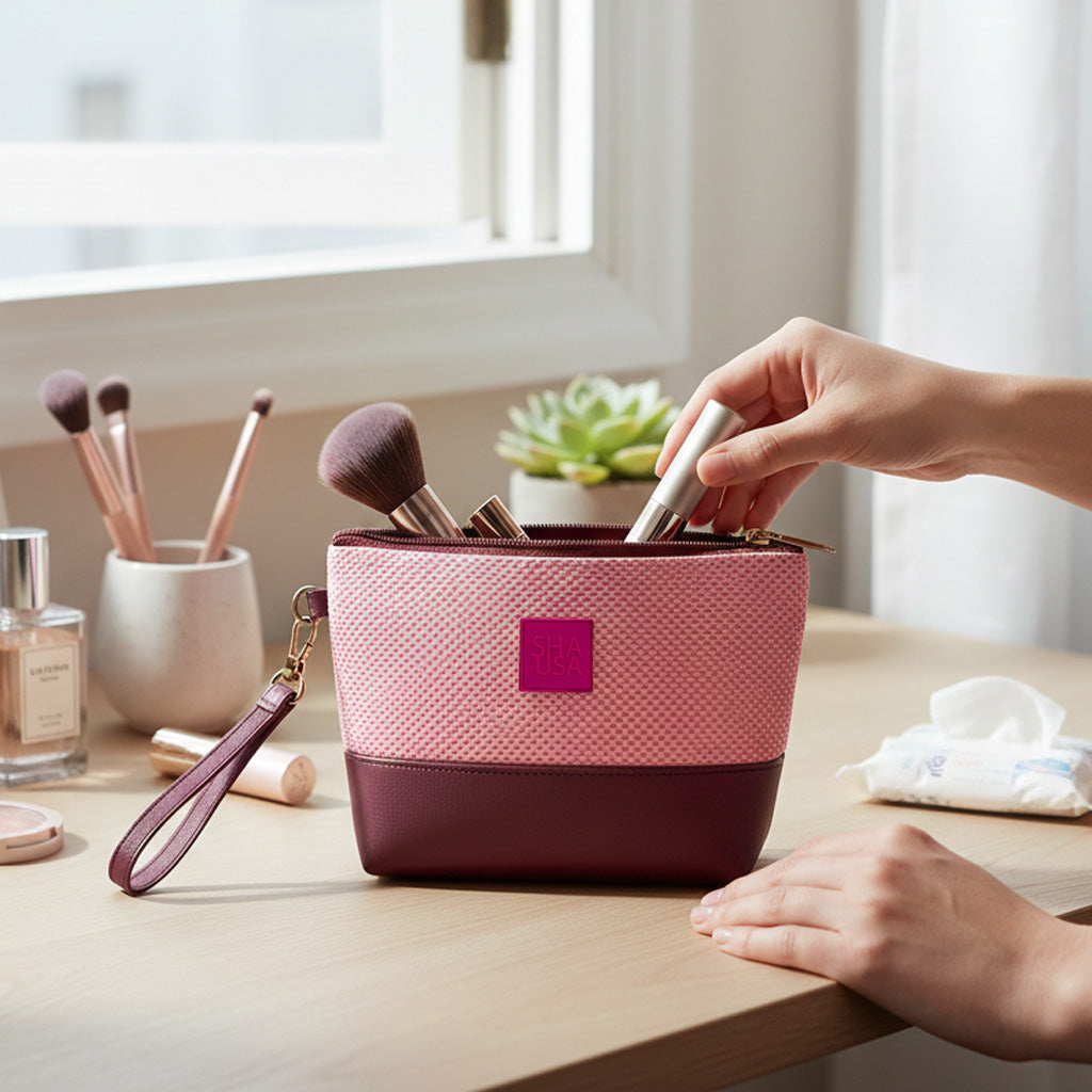 Neceser con asa de mano, confeccionado en tejido técnico, brillante, con textura y base en polipiel. Práctico y resistente, ideal para llevar cosmética, maquillaje o esenciales de viaje con total comodidad. Un diseño funcional con un toque moderno.