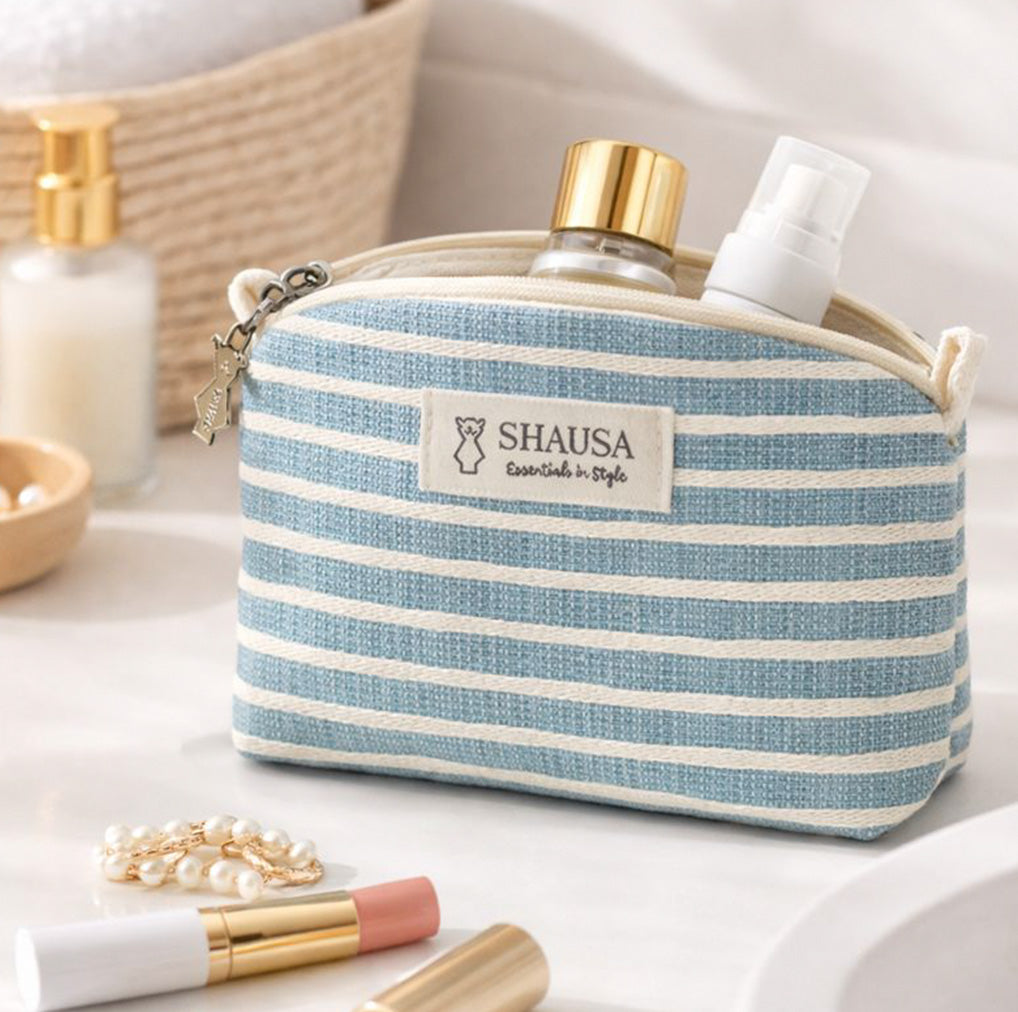 Este neceser pequeño semicircular de rayas azul y blanco combina diseño marinero y practicidad en un formato compacto y ligero. Confeccionado en poliéster resistente con detalle en relieve de cuerda de algodón, aporta textura y personalidad al tejido.
