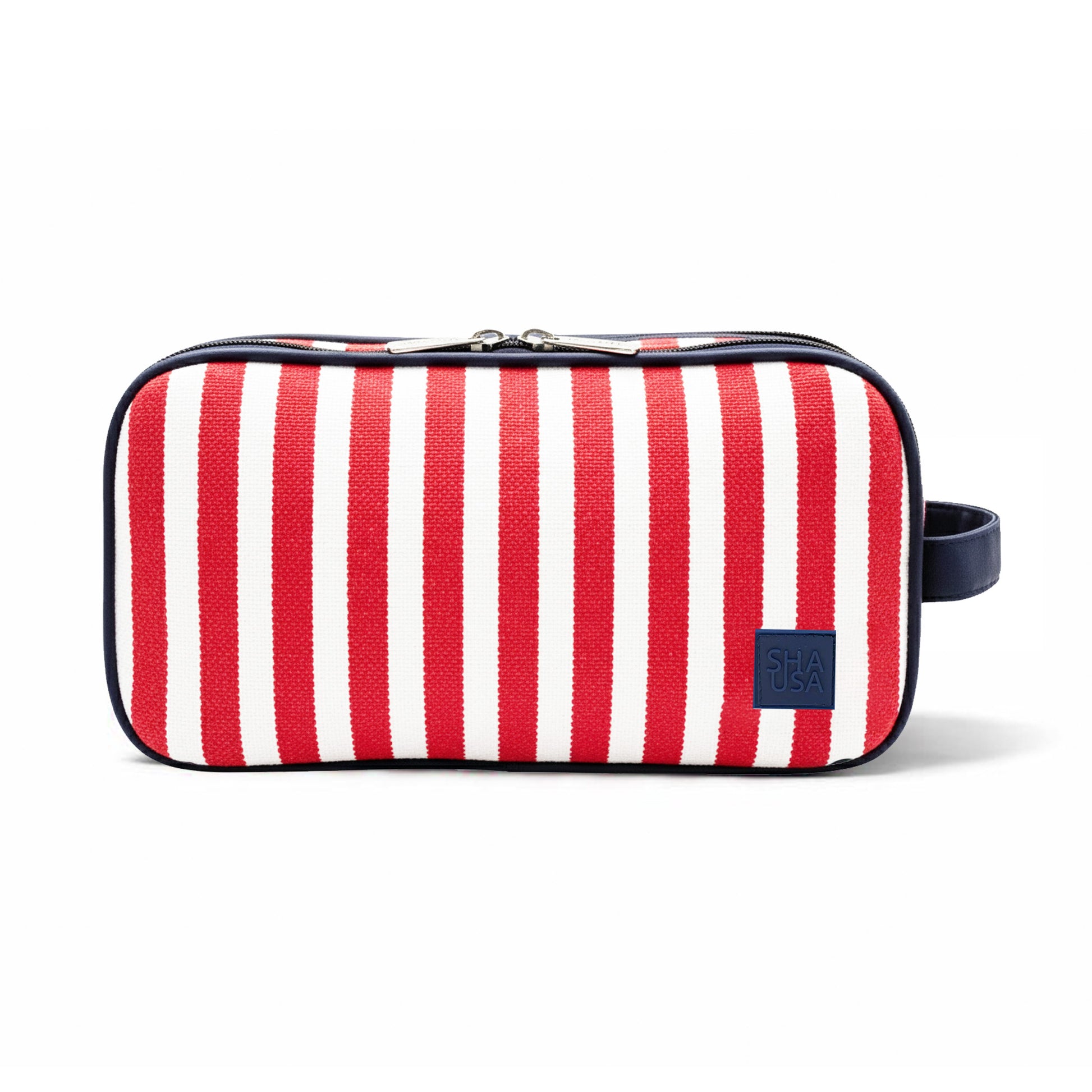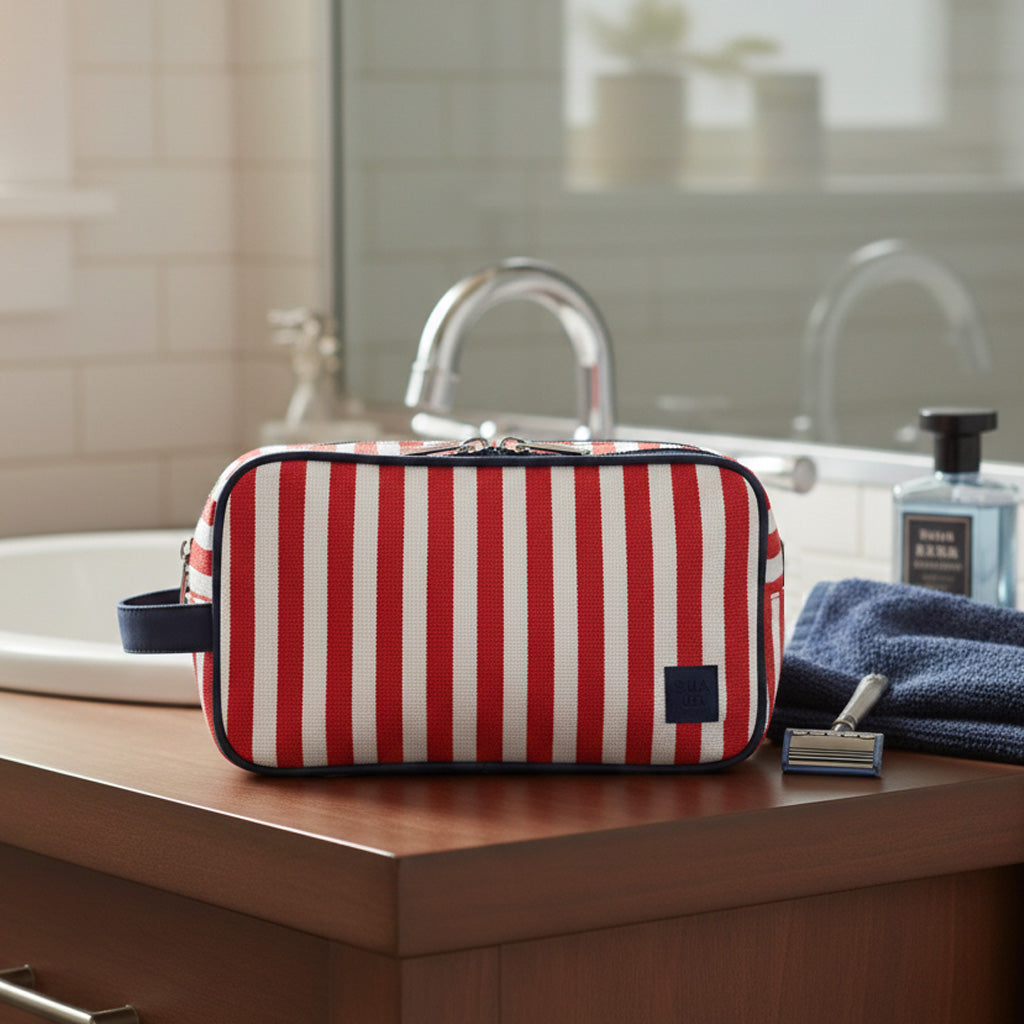 Neceser de hombre con doble cremallera, dos compartimentos. Diseño clásico de rayas, práctico y resistente. Ideal para organizar artículos de aseo y viaje, combina funcionalidad y estilo atemporal para el día a día o escapadas.