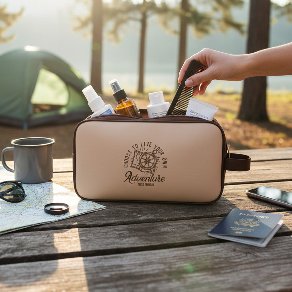 Neceser de estilo aventurero con diseño sobrio y elegante. Práctico y resistente, ideal para organizar artículos de aseo en viajes y escapadas, combinando funcionalidad y carácter atemporal. Tiene doble cremallera con dos compartimentos.