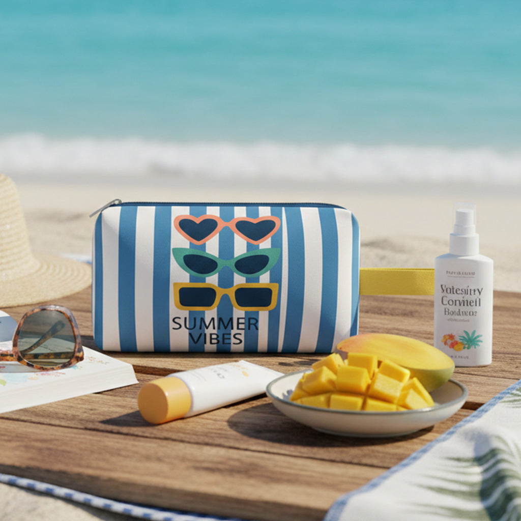 Neceser de estilo veraniego con estampado de rayas y gafas, ideal para llevar maquillaje y pequeños básicos. Práctico, ligero y perfecto para dar un toque alegre y fresco a tu día a día.